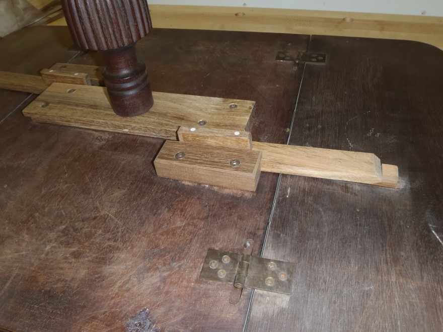 Harrison folding table was brought to the shop for repair. This table had a date on 1938 written on the old broken piece I replaced. Hinges were realigned, new central base, slides and wedges were fabricated to get her back on the front room floor.