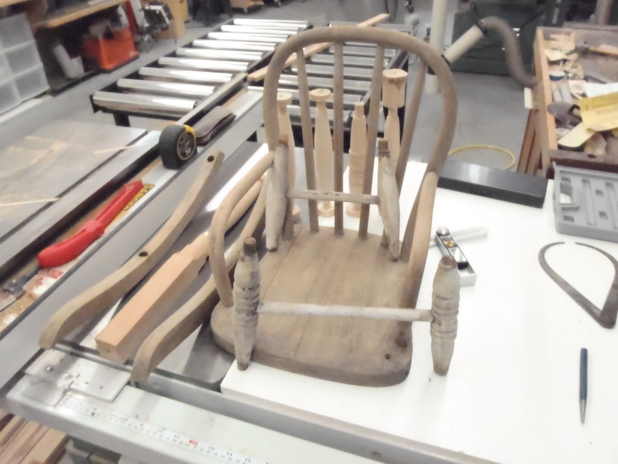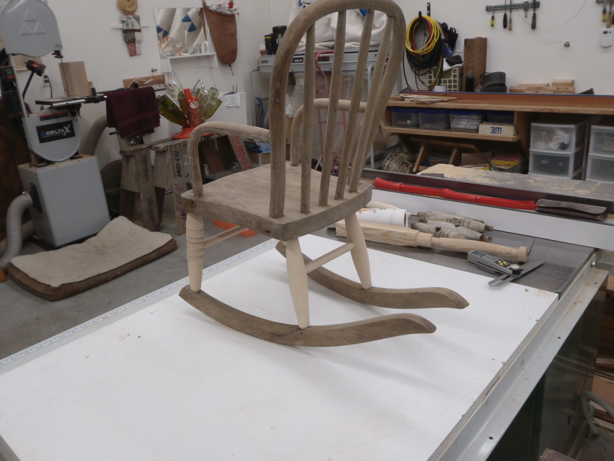 This project came to the shop in pieces as you can see. The chair is approximately 100 years old and was one of the first sitting spots for my wife's father. Originally it came completely painted white so wood identification was not possible. As this chair was built in Eastern Canada I assumed that an Eastern Maple would be a good guess so I purchased material at Lee Valley in Victoria to turn new legs. Old repairs that were done were done with nails. Not the first choice for furniture repair. After much time and utilizing several different tools, I managed to remove the nails with minimal damage to the chair. Now that all the paint was removed, Walnut was the wood the chair was constructed of. The legs were already completed so the search was on for a stain that would do the job. I found just the right product and am pleased with the final result. The time involved to complete this rebuild was well worth the time after Jane and my mother-in-law, Mary Jane saw the final piece. For years this chair sat in pieces and now it has a new start again for our grandchildren. As my grand-daughter Riley says "Goodjob!"